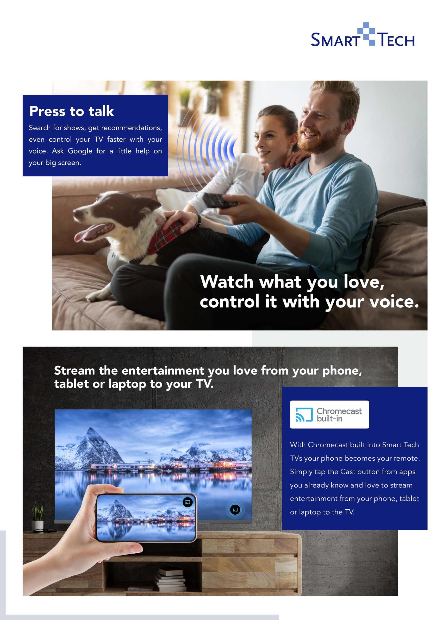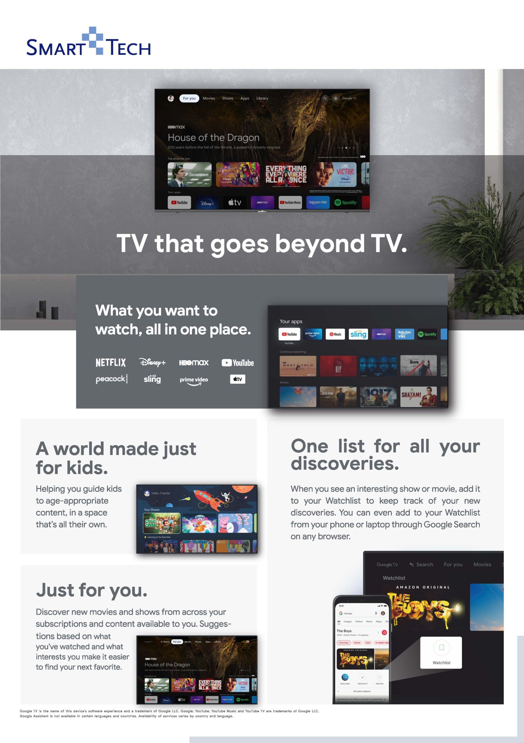 • Operating system: Google TV, Direct access Netflix, YouTube; Google Assistant, Built-in Chromecast